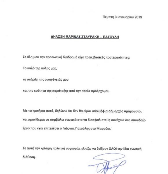 Η σύζυγος του απερχόμενου δημάρχου Αμαρουσίου, Γιώργου Πατούλη, με μια λιτή δήλωσή της ανακοινώνει ότι αποσύρει την υποψηφιότητά της για τη δημαρχία του Αμαρουσίου.