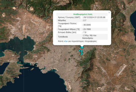 Σύμφωνα με το Γεωδυναμικό Ινστιτούτο του Εθνικού Αστεροσκοπείου Αθηνών, το εθνικό σεισμολογικό δίκτυο κατέγραψε ασθενή σεισμική δόνηση με μέγεθος 4,3 στην κλίμακα Ρίχτερ, στις 10:02 το πρωί.