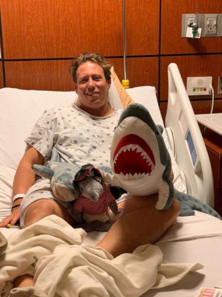 Ένας φίλος του που βρισκόταν σε σκάφος κοντά στο σημείο, τού έβαλε μια αιμοστατική ταινία στο πόδι και κάλεσε βοήθεια.