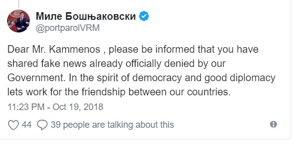 «Αγαπητέ κύριε Καμμένε, ενημερωθείτε παρακαλώ, ότι έχετε ήδη μοιραστεί fake news, τα οποία έχουν επίσημα διαψευσθεί από την Κυβέρνησή μας. Στο πνεύμα της δημοκρατίας και της καλής διπλωματίας ας δουλέψουμε για την φιλία μεταξύ των χωρών μας», ανέφερε στο Twitter.