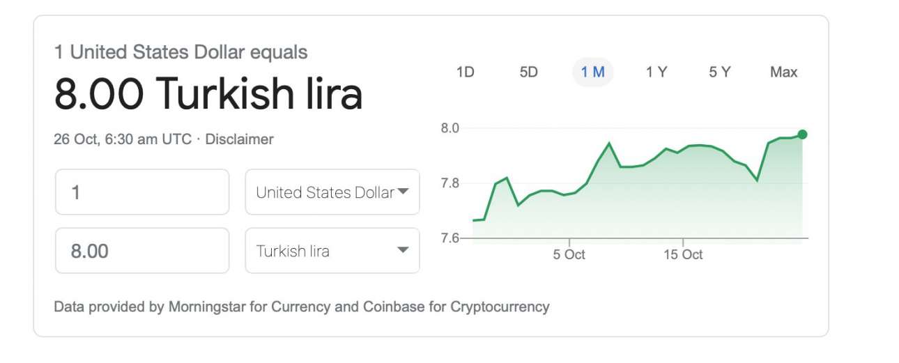 Μόνο μέσα στο 2020 η λίρα έχει χάσει το 25% της αξίας της έναντι του δολαρίου, ενώ πριν από πέντε χρόνια η ισοτιμία ήταν περί τις 3 λίρες ανά δολάριο. Είναι η χειρότερη επίδοση στον κόσμο για φέτος, μαζί με το βραζιλιάνικο ρεάλ.