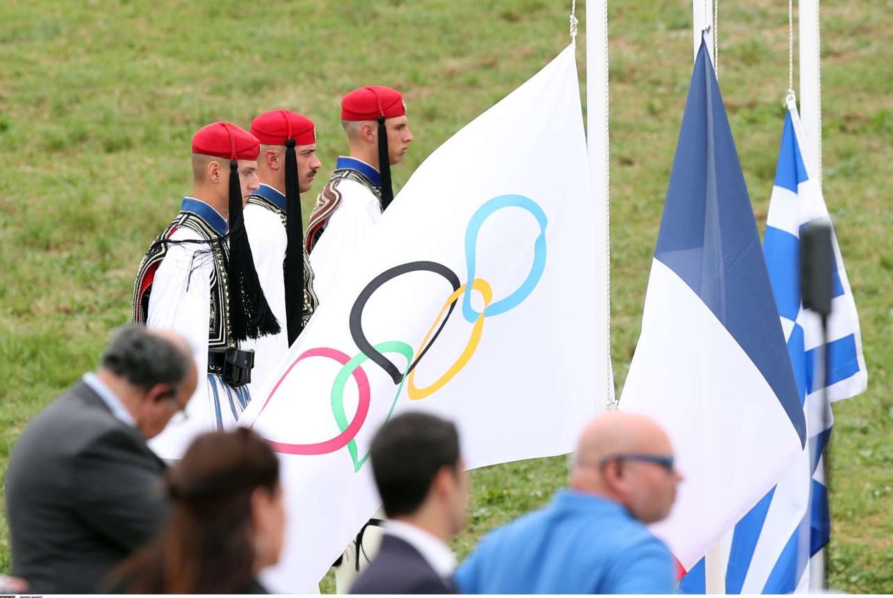Η τελετή αφής της Ολυμπιακής Φλόγας άρχισε με την έπαρση της ελληνικής και της γαλλικής σημαίας από άγημα της Προεδρικής Φρουράς, για να ακολουθήσουν οι ομιλίες των επισήμων, παρουσία της Προέδρου της Δημοκρατίας Κατερίνας Σακελλαροπούλου, η οποία προσήλθε στην Αρχαία Ολυμπία συνοδευόμενη από τον πρόεδρο της Διεθνούς Ολυμπιακής Επιτροπής (ΔΟΕ) Τόμας Μπάχ και τον πρόεδρο της Ελληνικής Ολυμπιακής Επιτροπής, Σπύρο Καπράλο (φωτογραφία κάτω).