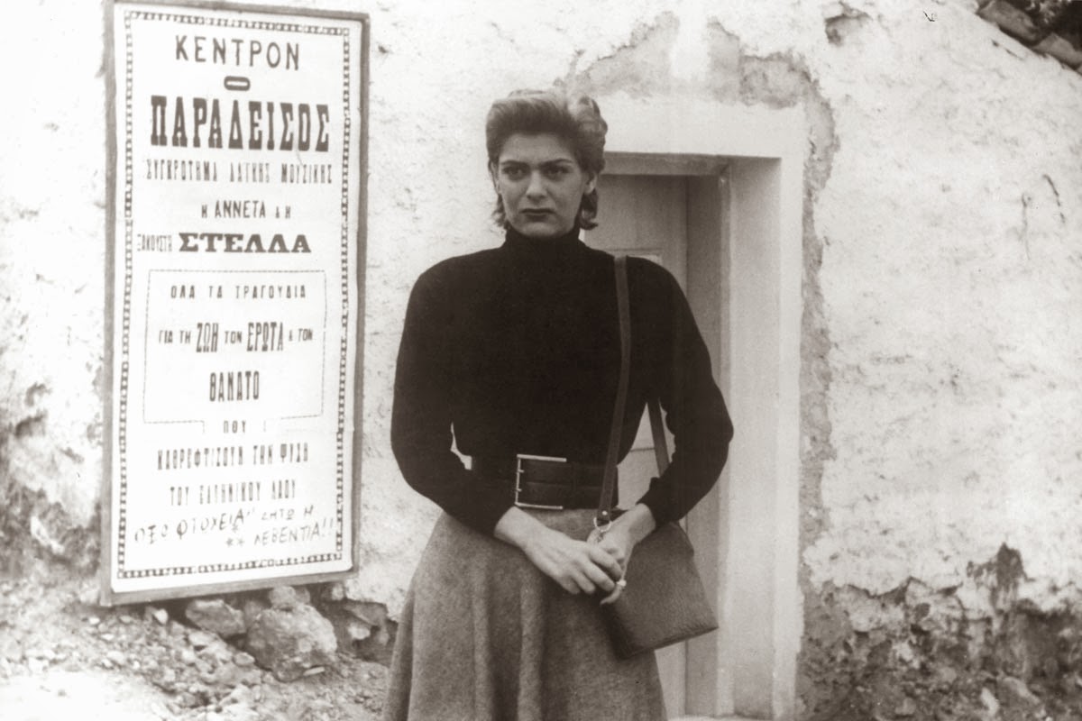 Φωτογραφημένη από τον σπουδαίο Αριστοτέλη Σαρρηκώστα, σε ένα διάλειμμα των γυρισμάτων ντοκιμαντέρ του BBC, με τίτλο «Η Ελλάδα της Μελίνας» το 1965
