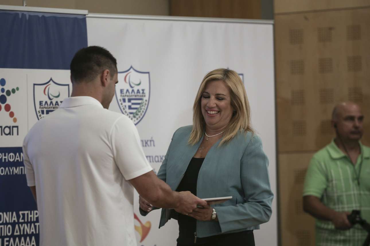 Η πρόεδρος του ΠΑΣΟΚ, Φώφη Γεννηματά, δίνει τις ευχές της στους αθλητές λίγο προτού αναχωρήσουν για το Ρίο