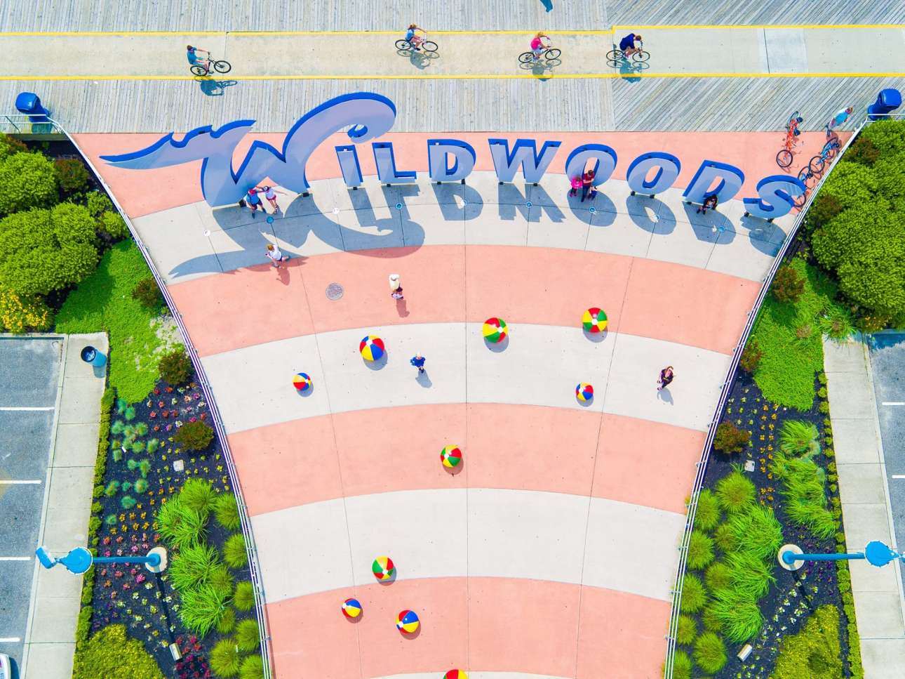Μια τεράστια πινακίδα και πολύχρωμες τσιμεντένιες μπάλες θαλάσσης κοσμούν το πεζοδρομημένο παραλιακό μέτωπο του Νιου Τζέρσεϊ