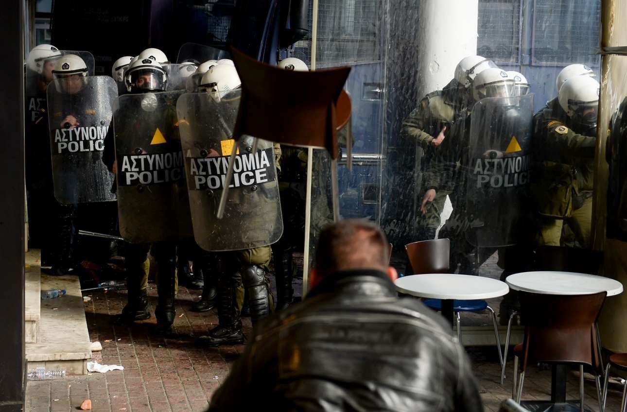 Σκηνές σκληρού ροκ. Δύο άνδρες των ΜΑΤ σέρνουν από τα ρούχα κάποιον διαδηλωτή ενώ δέχονται τα χτυπήματα από άλλους