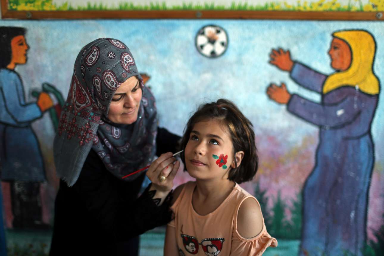 10 Ιουλίου. Mικρό κορίτσι από την Παλαιστίνη βάφει το πρόσωπό του σε θερινή κατασκήνωση που διοργάνωσε στη Γάζα το Γραφείο Αρωγής του ΟΗΕ για τους Παλαιστίνιους Πρόσφυγες