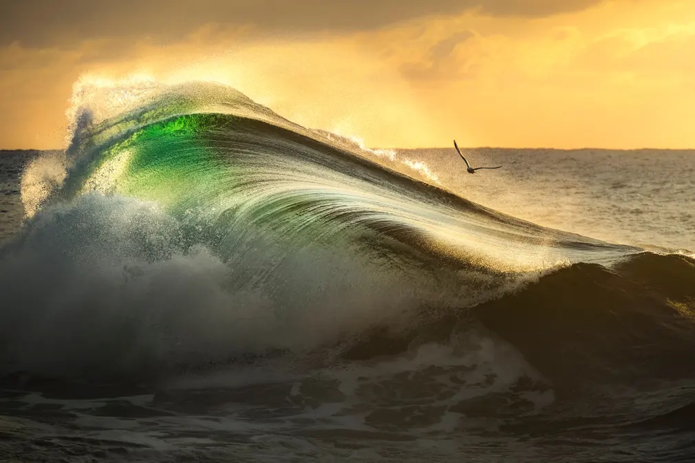 «O Γρύπας». Ο σέρφερ χάνεται μέσα σε αυτό το εντυπωσιακό κύμα πάνω από το οποίο πετά ένα θαλασσοπούλι σε ένα σκηνικό που θύμισε στον φωτογράφο τον γρύπα, το μυθολογικό τέρας με σώμα λιονταριού και κεφάλι και φτερά αετού.