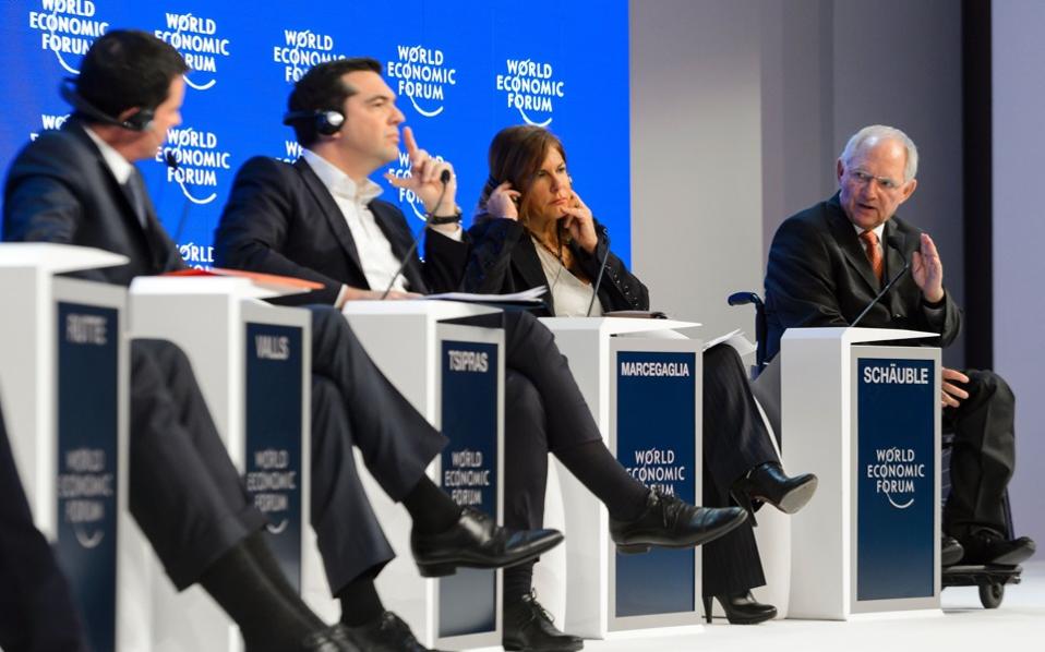 Ιανουάριος 2016. Ο Αλέξης Τσίπρας στο Νταβός σε ένα κοινό πάνελ με τον Σόιμπλε. Σε μια παράφραση της γνωστής ρήσης του Μπιλ Κλίντον, ο Γερμανός του λέει: «Είναι η εφαρμογή των συμφωνιών, ανόητε!». Ο Πρωθυπουργός κάνει πως δεν ακούει...