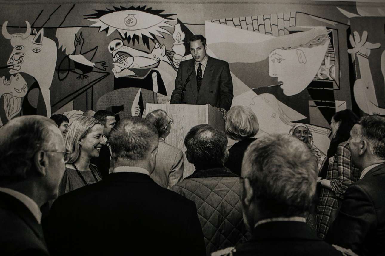 «Η φύση του τέρατος» - Για την εικόνα: «Αυτή η ταπισερί είναι μια μεταγραφή σε υφαντό μιας σύνθεσης από φωτογραφίες ρεπορτάζ που απεικονίζουν σκηνές από την έκθεση της καλλιτέχνιδας στη γκαλερί Whitechapel στο Λονδίνο. Για τη Whitechapel, η Ματσούγκα δανείστηκε την εκδοχή σε ταπισερί της Γκουέρνικα του Πικάσο από το κτίριο του ΟΗΕ στη Νέα Υόρκη και την εγκατέστησε στη γκαλερί, όπου αποτέλεσε το φόντο για δημόσιες συναντήσεις, ομιλίες και εκδηλώσεις. Η ταπισερί που παρουσιάζεται στην παρούσα έκθεση απεικονίζει μια ομιλία που δόθηκε από τον πρίγκιπα Ουίλιαμ μπροστά από την ταπισερί της Γκουέρνικα, και αποτελεί την κριτική της καλλιτέχνιδας πάνω στο έργο της ιδίας αλλά και τον τρόπο με τον οποίο παρακάμπτεται το πολιτικό νόημά του. Απηχεί επίσης την ιστορία των βασιλικών εργαστηρίων ταπισερί, καθώς και το πώς η εικονογραφία των βασιλικών εμφανίσεων περνούσε συχνά μέσα από αυτό το μέσο»