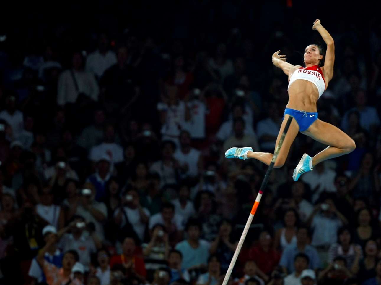 Μάικ Μπλέικ: «Κάλυπτα την απονομή στον στίβο και σε ένα διάλειμμα έστριψα αλλού τον φακό μου για να αποτυπώσω άλλα αθλήματα. Η συγκεκριμένη φωτογραφία είναι της Ρωσίδας του άλματος επί κοντώ που κέρδισε το χρυσό μετάλλιο». Πεκίνο 2008 - Η Γελένα Ισινμπάγιεβα ίπταται στον ουρανό της Κίνας. Η πρωταθλήτρια του άλματος επί κοντώ δεν θα συμμετέχει στους Ολυμπιακούς Αγώνες του Ριο εξαιτίας της τιμωρίας που έχει η Ομοσπονδία της Ρωσίας μετά το γνωστό σκάνδαλο ντόπινγκ