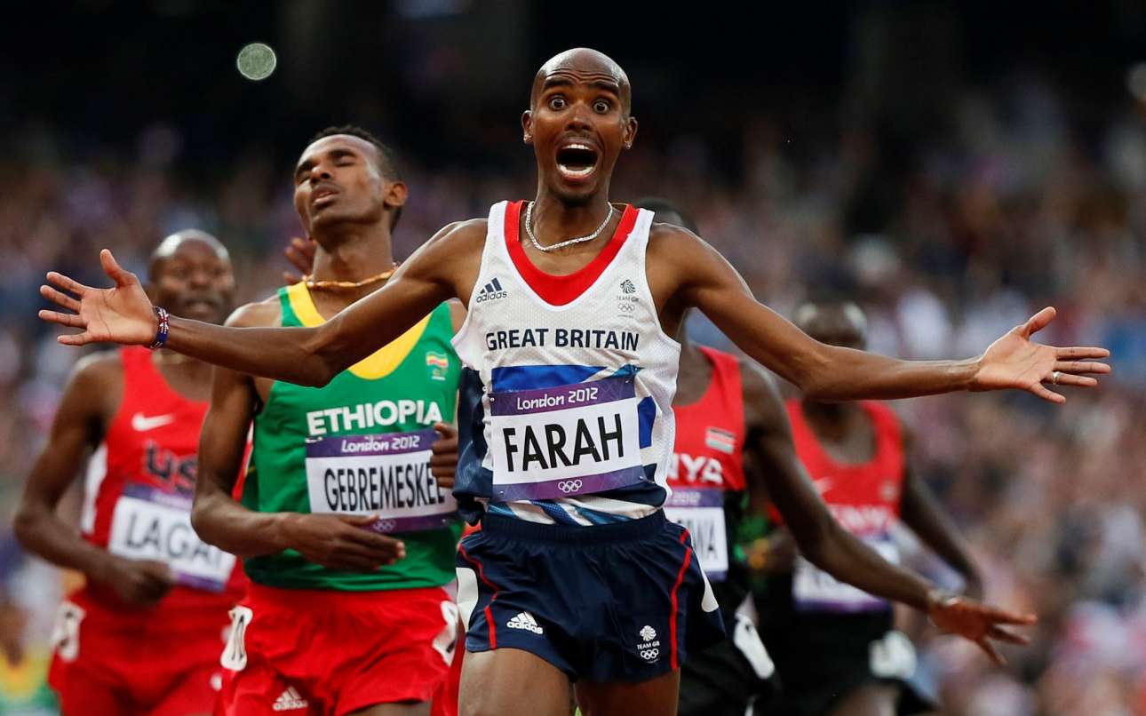 Λούσι Νίκολσον: «Οταν ο Μο Φαρα γυρνούσε στην τελευταία γωνία των 5 χιλιομέτρων, όλοι στο τεράστιο στάδιο ήταν όρθιοι. Ο βρετανός ήξερε ότι θα κερδίσει. Οι φωτογράφοι ήταν ενθουσιασμένοι γιατί ήξεραν ότι οι αντιδράσεις του θα ήταν έντονες. Τελικά ήταν μία υπέροχη σειρά φωτογραφιών καθώς ο Φαρα έφτανε στην γραμμή του τερματισμού. Εβαλε τα χέρια στο κεφάλι του και μετά τυλίχτηκε με την βρετανική σημαία. Ηταν μία μεγάλη ακολουθία πανηγυρισμών. Οτι ακριβώς ελπίζει ένας φωτογράφος». Λονδίνο 2012 - Μετά από πέντε χιλιόμετρα δρόμο, ο ενθουσιασμός παραμένει