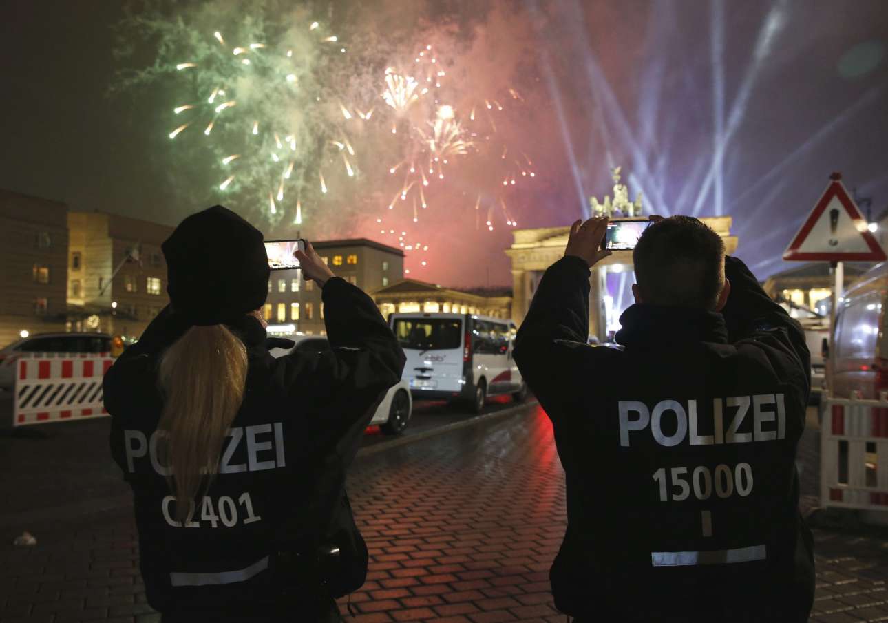 Ακόμα και οι αστυνομικοί στο Βερολίνο έκαναν ένα διάλειμμα φωτογραφίζοντας τα πυροτεχνήματα στον ουρανό της πόλης
