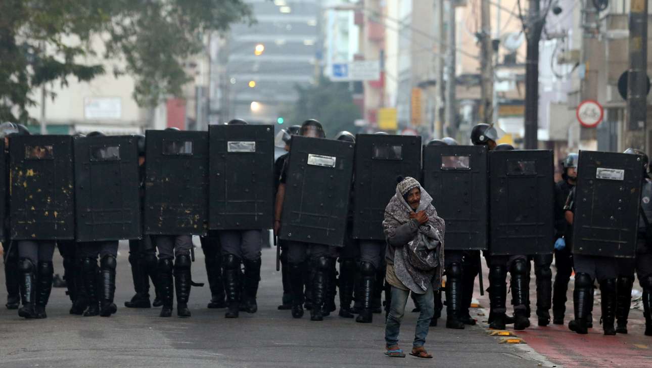 12 Ιουν. Εκείνοι οχυρωμένοι πίσω από ασπίδες, επικαλαμίδες και κράνη, ομοιόμορφα ντυμένοι και συμμετρικά παρατεταγμένοι. Εκείνος, με δύο διαφορετικές σαγιονάρες, βρόμικο τζιν, σκουφί και κουβέρτα, εντελώς αποπροσανατολισμένος από την επίδραση των ουσιών, κατά τη διάρκεια αστυνομικής επιχείρησης στο κέντρο του Σάο Πάολο