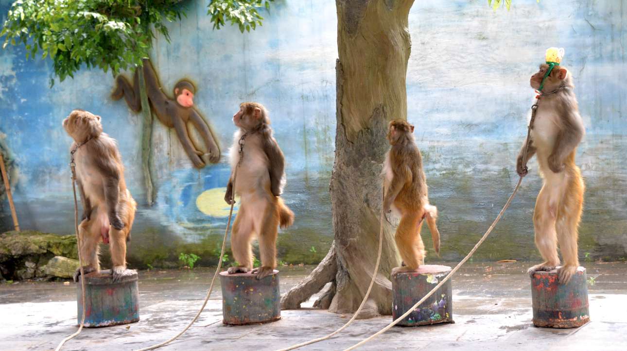 12 Ιουν. Αλυσοδεμένες και υπάκουες, οι μαϊμούδες αναμένουν την εντολή από τον εκπαιδευτή τους, στο Ζουνγί της Κίνας