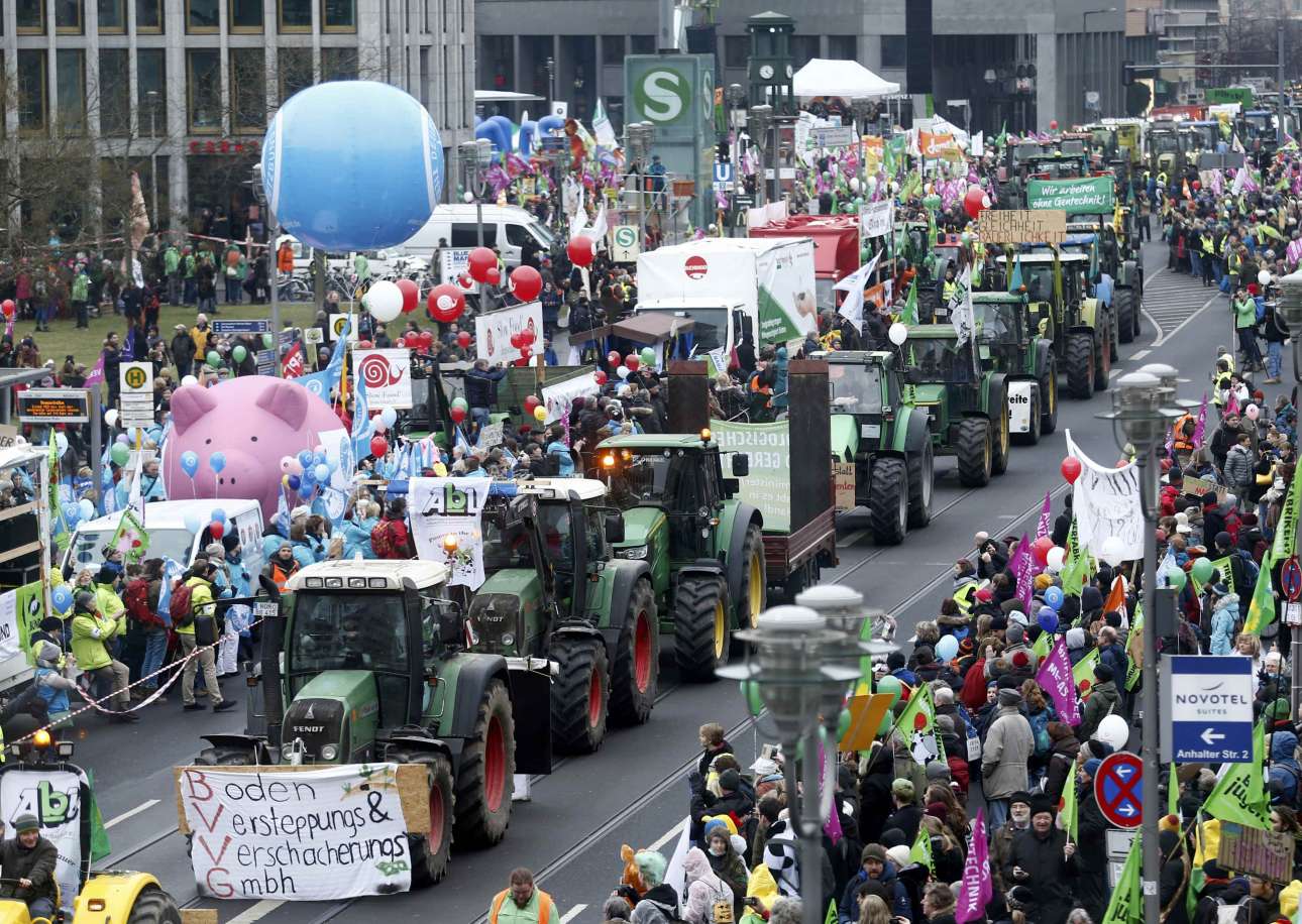 21 Ιαν. Πορεία αγροτών με τρακτέρ σαν κι αυτές που έχουμε βιώσει στην Ελλάδα. Αλλά στη Γερμανία και συγκεκριμένα στο Βερολίνο, οι αγρότες διαμαρτύρονται κατά της υιοθέτησης της γενετικής μηχανικής στη γεωργία. Και παρελαύνουν μαζί με γιγάντια λούτρινα αρκουδάκια