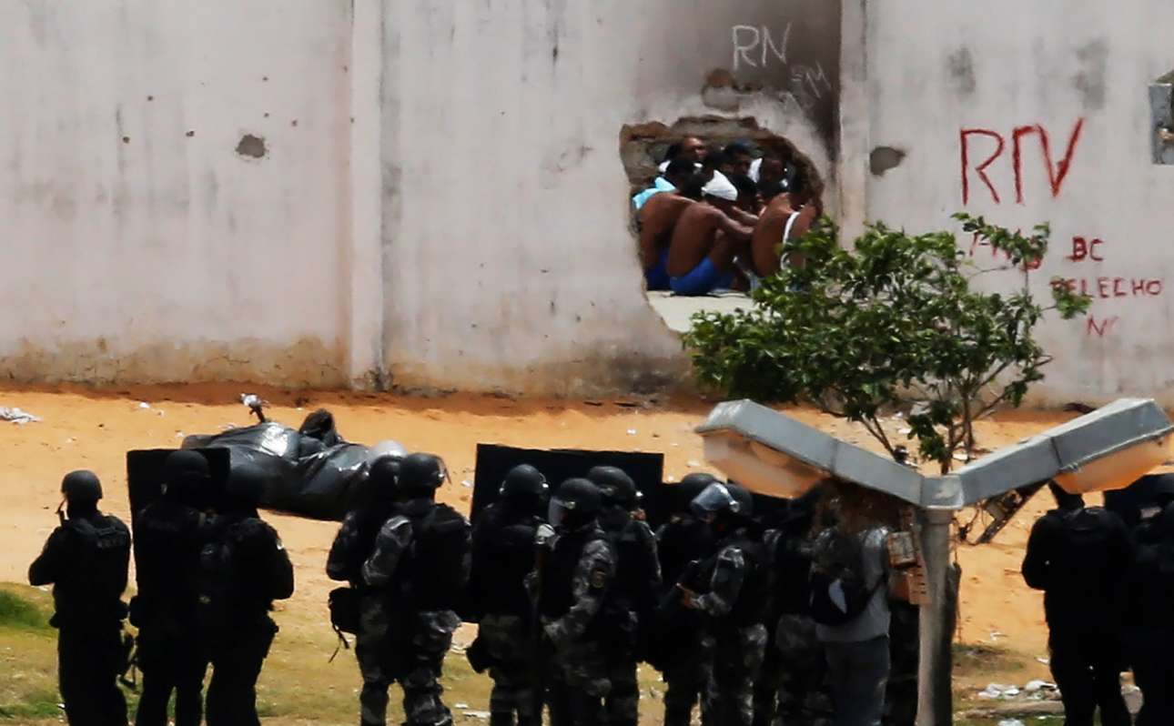 21 Ιαν. Μέσα από μία τρύπα στον τοίχο φαίνονται οι κρατούμενοι της φυλακής Αλκασουίς κοντά στη Νατάλ, στη βορειοανατολική Βραζιλία όπου σκοτώθηκαν δεκάδες άτομα σε βίαια επεισόδια που ξέσπασαν μετά την εξέγερση των φυλακισμένων