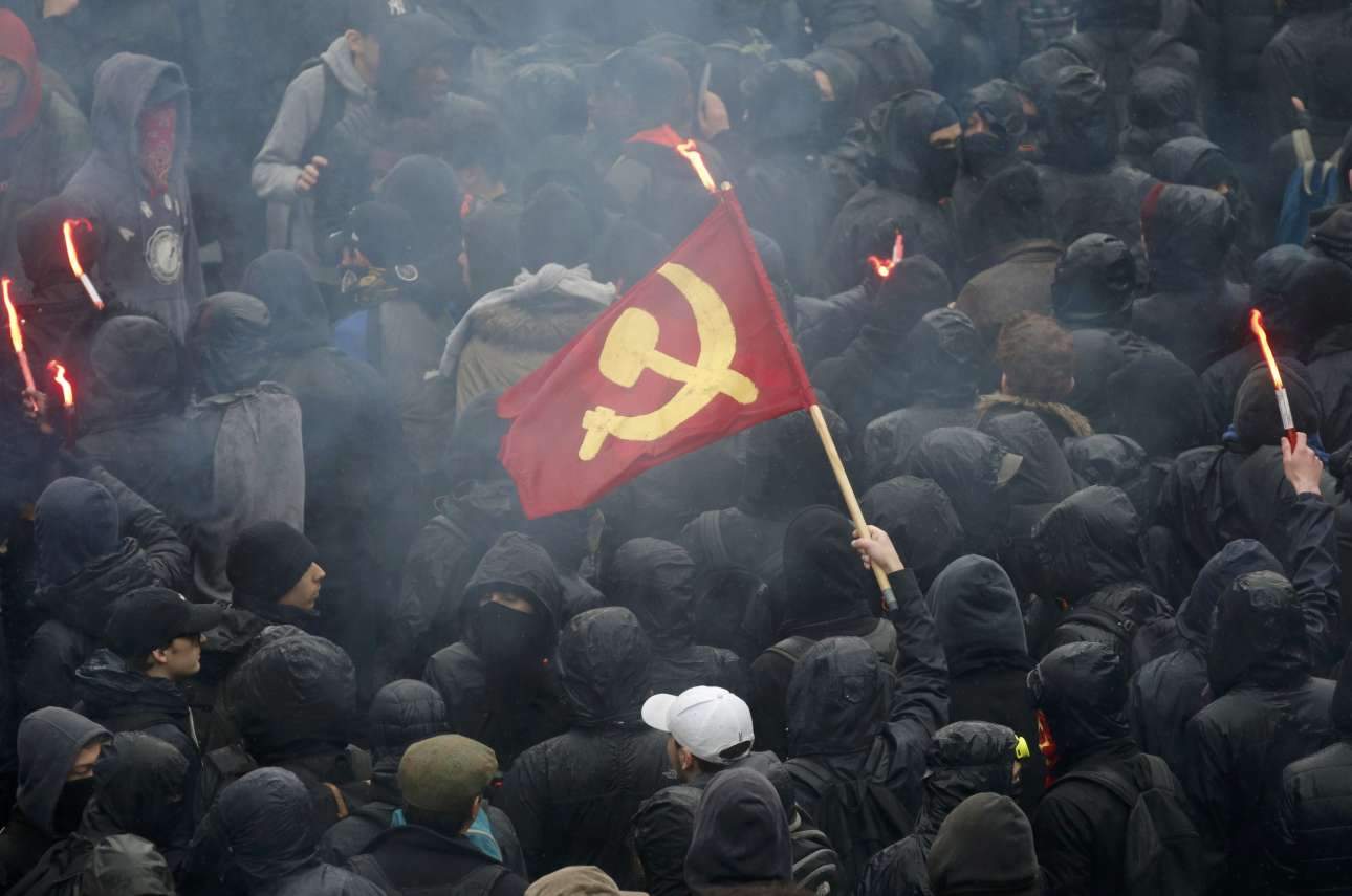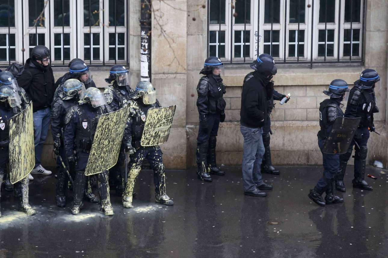 Η αστυνομικές δυνάμεις του Παρισιού στα στενά της πόλης. Εδώ φαίνεται να έχουν δεχτεί επίθεση με μπογιές