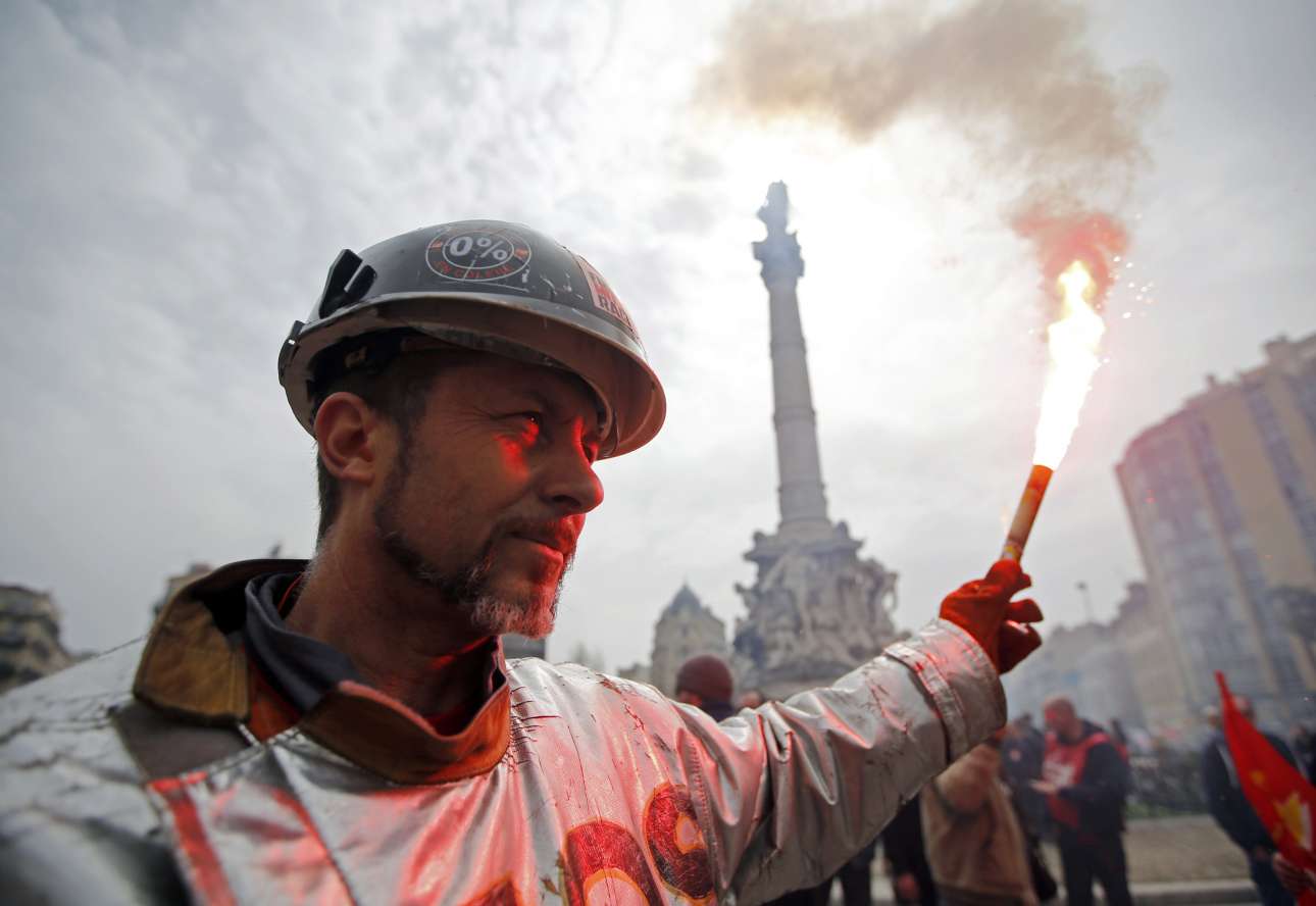 Εργαζόμενος στην πολυεθνική μεταλλευτική εταιρεία ArcelorMittal διαδηλώνει με την εργατική του φόρμα