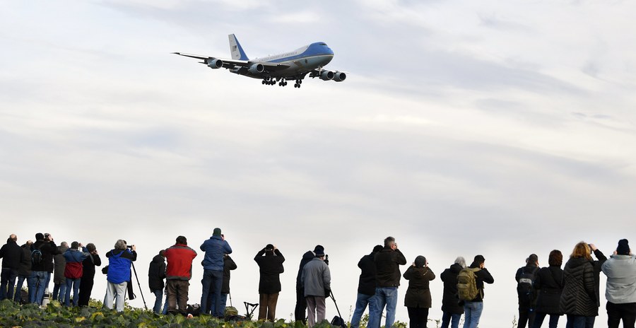 Το Boing 747 προσγειώνεται στο αεροδρόμιο της Ζυρίχης ενώ δεκάδες δημοσιογράφοι και φωτορεπόρτερ περιμένουν τον Ντόναλντ Τραμπ