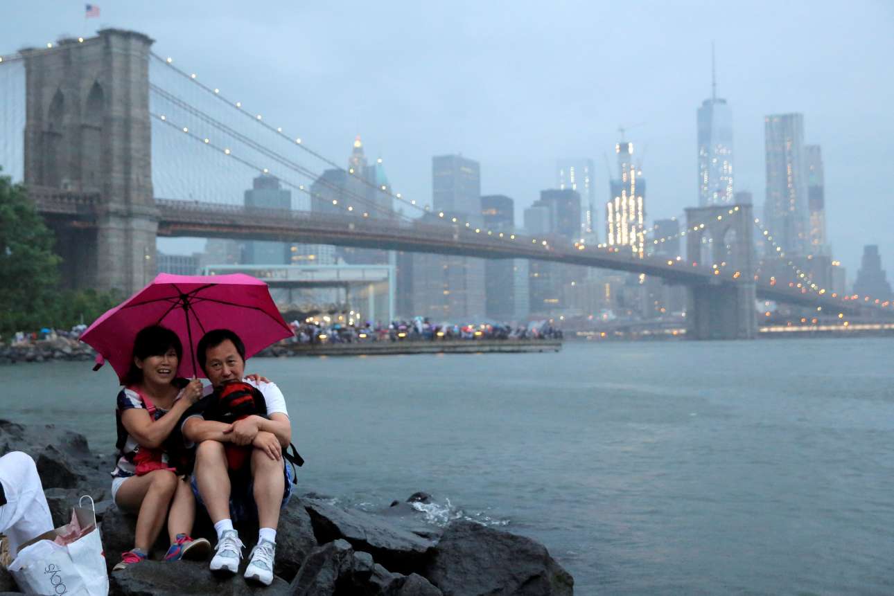 Εθνικοπατριωτικό κιτς. Νεοϋορκέζοι και τουρίστες σπεύδουν στον χώρο όπου θα λάβει χώρα το σόου με τα πυροτεχνήματα στις όχθες του Ιστ Ρίβερ στο Μανχάταν