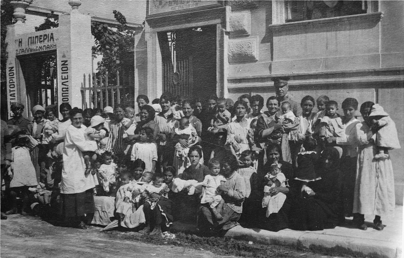 «Κάποιοι μελλοντικοί Αθηναίοι». Μητέρες με τα παιδιά τους αγκαλιά έξω από κλινική του Αμερικανικού Ερυθρού Σταυρού στην Αθήνα. Εκεί πήγαιναν τα παιδιά τους για να ζυγιστούν, να καθαριστούν και να πάρουν φάρμακα, ενώ οι ίδιες μάθαιναν πώς να τα φροντίζουν σωστά. Κάθε ημέρα 250 παιδιά επισκέπτονταν την κλινική