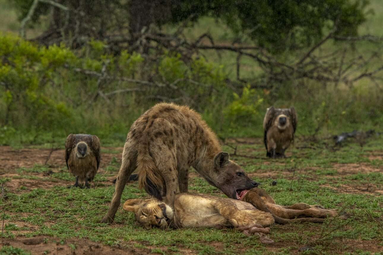 Το κουφάρι μιας λέαινας γίνεται εύκολη τροφή για τα υπόλοιπα ζώα της σαβάνας. Μια ύαινα καταβροχθίζει ήδη το κρέας της, ενώ στο βάθος, δυο γύπες περιμένουν υπομονετικά τη σειρά τους