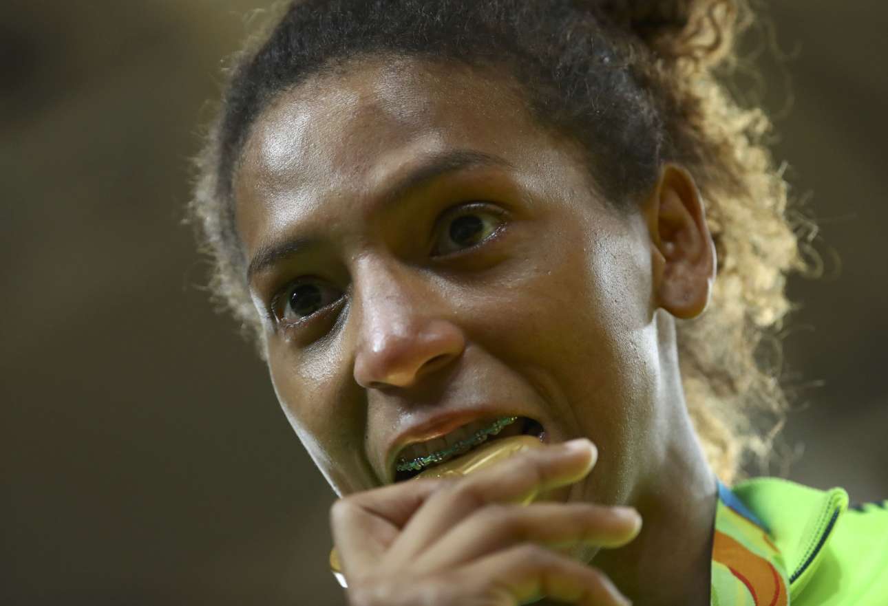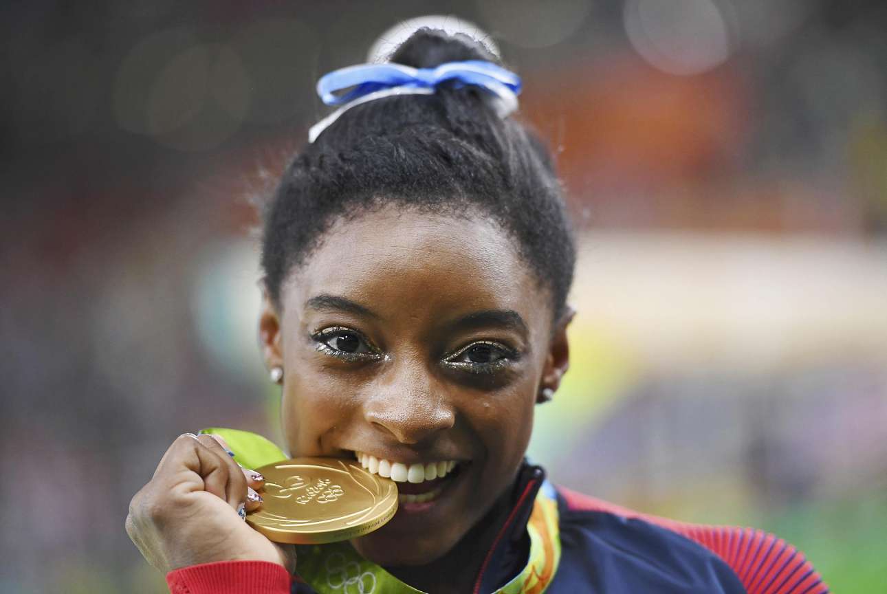 Συμμετείχε πρώτη φορά σε Ολυμπιακούς Αγώνες αλλά κατάφερε να μιλούν όλοι για αυτήν. Η δεκαεννιαχρόνη Αμερικανίδα Σιμόν Μπάιλς δαγκώνει το χρυσό μετάλλιο που κέρδισε στο σύνθετο ατομικό στη γυμναστική