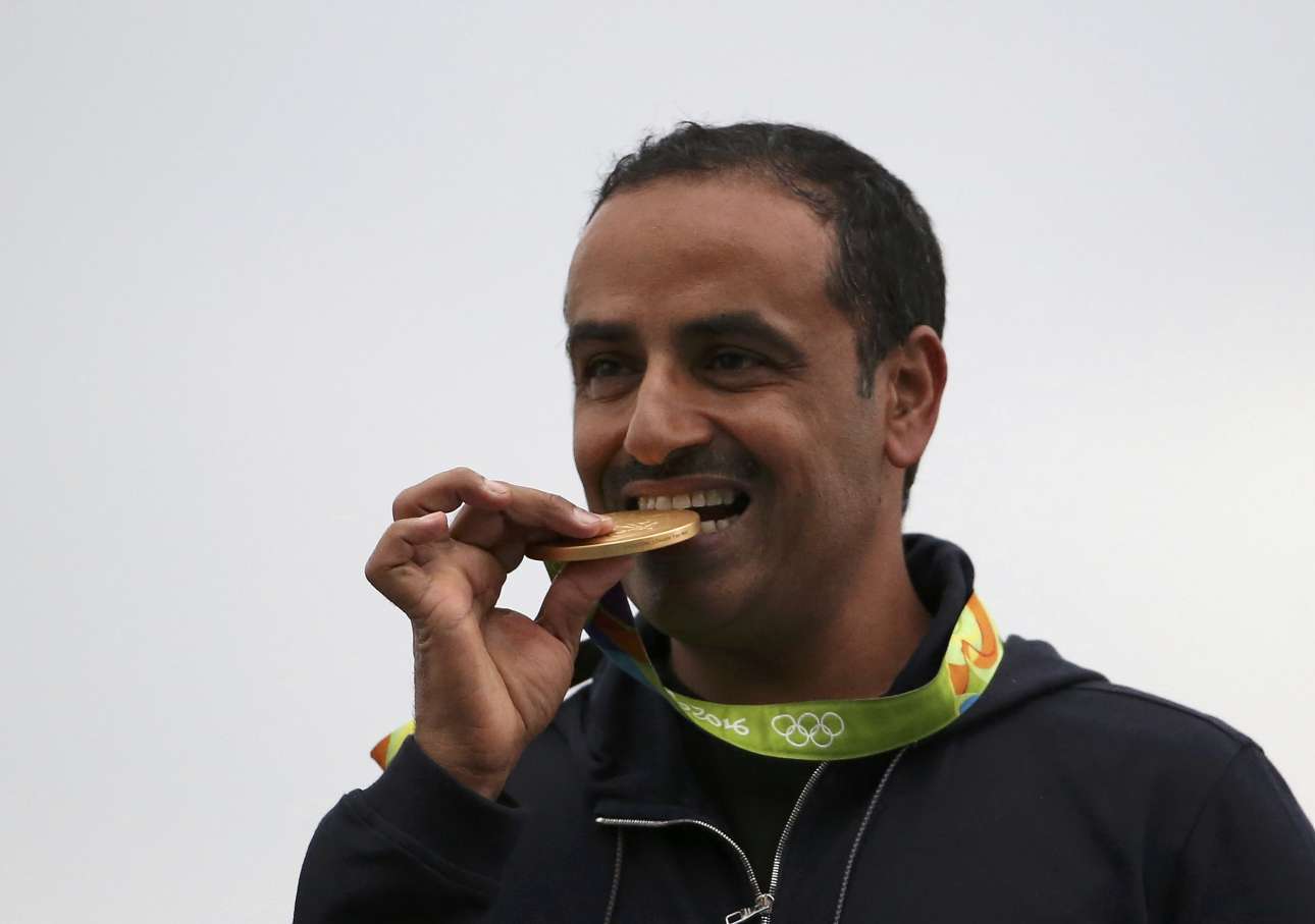 Ο Φεχαϊντ Αλντιχάνι, ο οποίος αγωνίστηκε ως ανεξάρτητος αθλητής από το Κουβέιτ μαζί με την Ολυμπιακή Προσφυγική Ομάδα, με το χρυσό μετάλλιο που κατέκτησε στην σκοποβολή ανάμεσα στα δόντια του