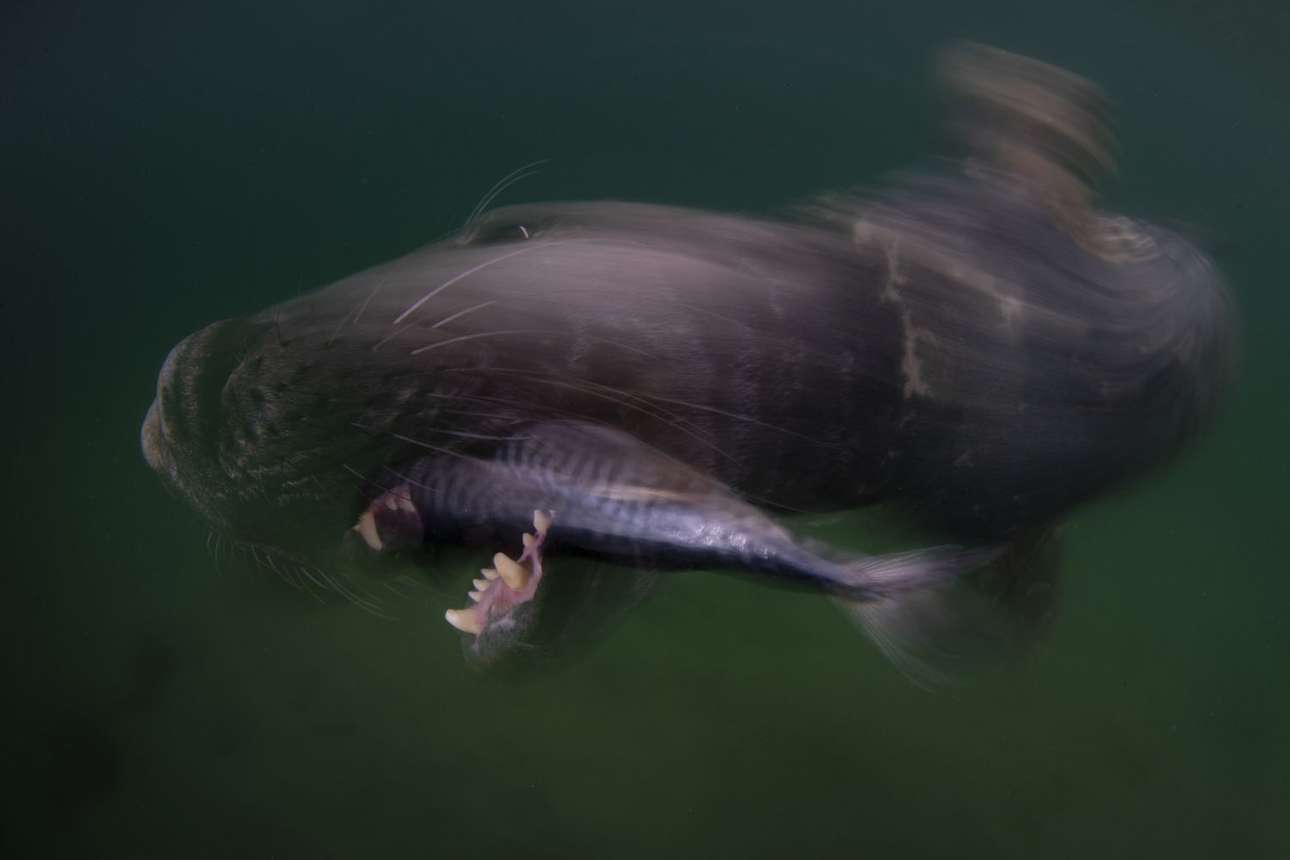 Τρίτη θέση, κατηγορία Κρύα Νερά. Νησιά Σέτλαντ, Σκωτία: ο φωτογράφος χρησιμοποιεί την τεχνική της μακράς έκθεσης όχι μόνο για να απαθανατίσει την ταχύτητα της γκρίζας φώκιας καθώς αρπάζει ένα ψάρι, αλλά και για να δώσει έμφαση στο πρόσωπό της