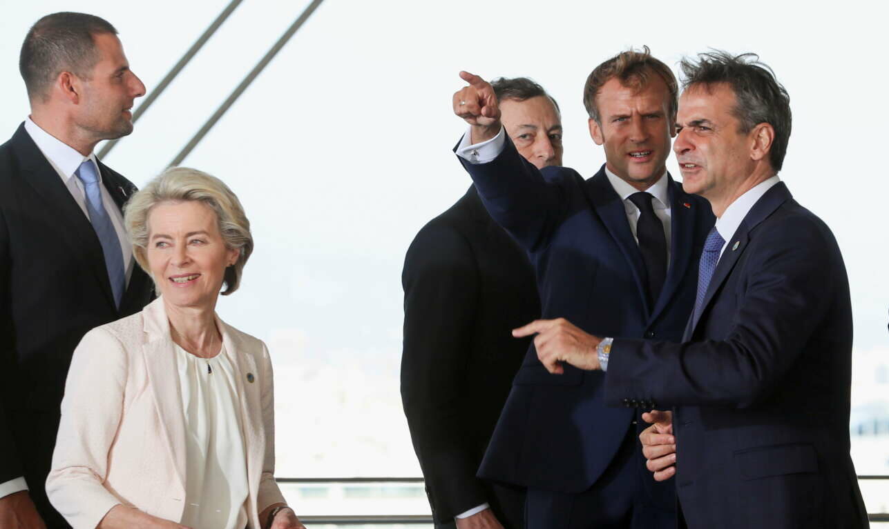 Ενα άλλο χαρακτηριστικό στιγμιότυπο από την ταράτσα του ΚΠΙΣΝ. Ο Εμανουέλ Μακρόν δείχνει κάτι στον Κυριάκο Μητσοτάκη, η Ούρσουλα φον ντερ Λάιεν κοιτάζει και αυτή. Ο Μάριο Ντράγκι μόνο έχει εντοπίσει τον φωτογραφικό φακό