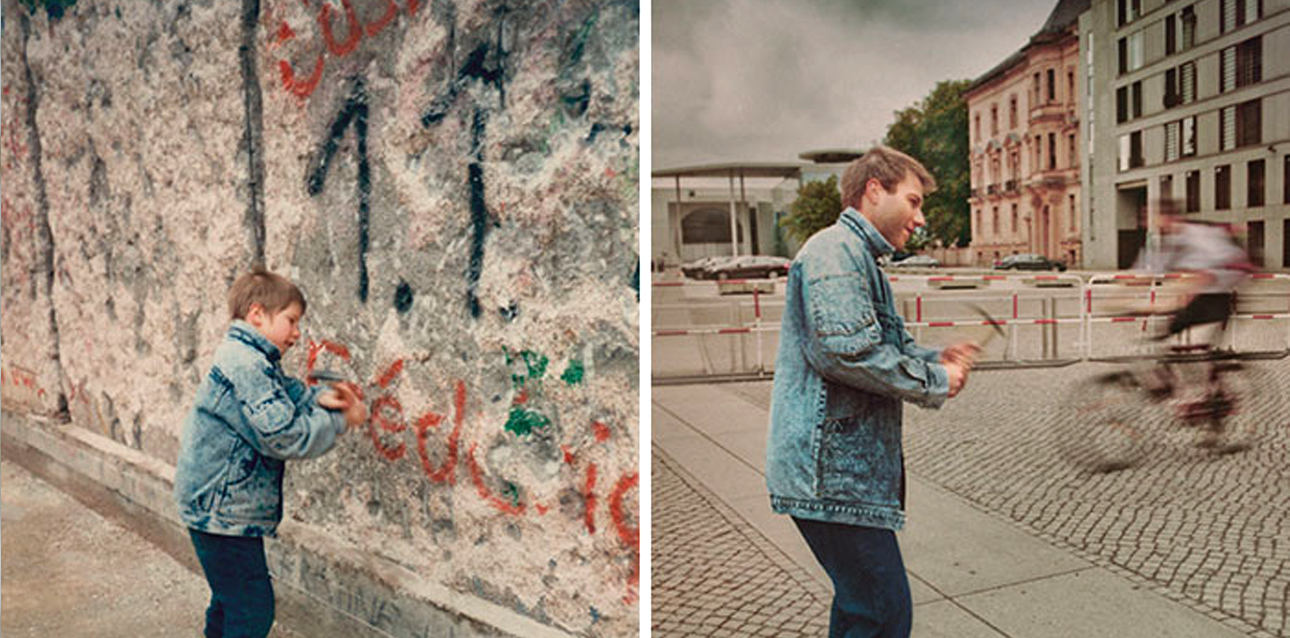 Ο Κριστόφ ποζάρει μπροστά στο Τείχος του Βερολίνου το 1990 και χωρίς το Τείχος εικοσιένα χρόνια αργότερα