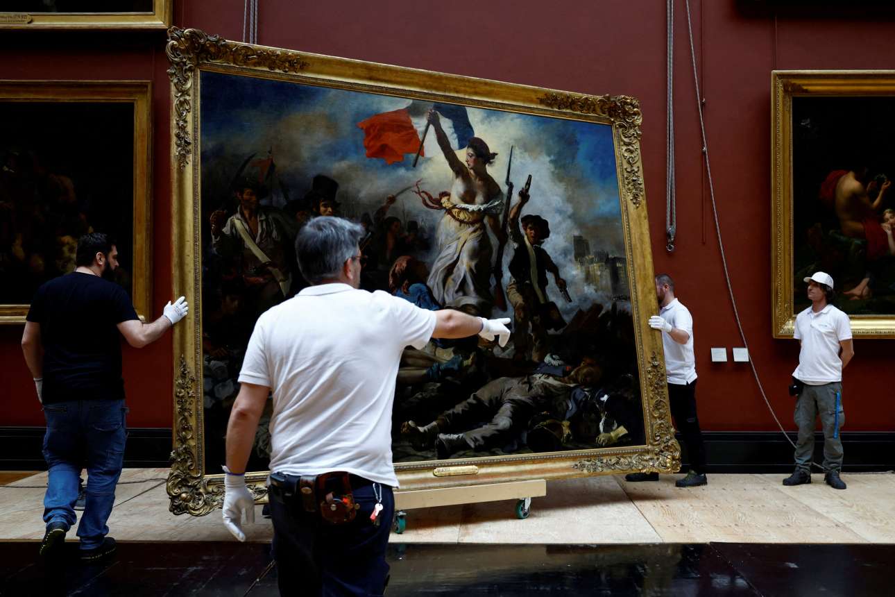 Εξι μήνες πέρασαν ώσπου να αποκατασταθεί ο εμβληματικός για τους Γάλλους πίνακας του Ντελακρουά «Η Ελευθερία οδηγεί τον λαό» – στο καρέ οι υπάλληλοι του Λούβρου τον επανατοποθετούν στη θέση του