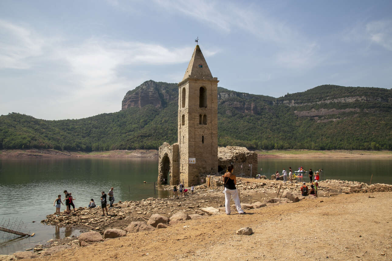 Οι επισκέπτες κοιτούν (αμήχανα;) την εκκλησία του 11ου αιώνα που ξεπροβάλλει από την, σχεδόν στεγνή, δεξαμενή Βιλανόβα ντελ Σολ στην Ισπανία