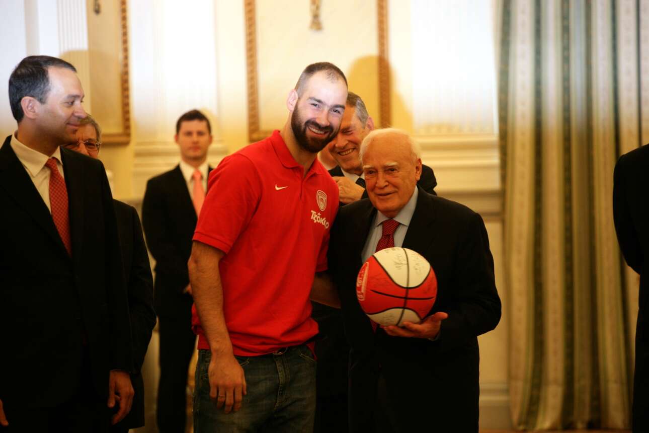 Ο Κάρολος Παπούλιας με τον Βασίλη Σπανούλη και μία μπάλα στα χρώματα του Ολυμπιακού το 2013