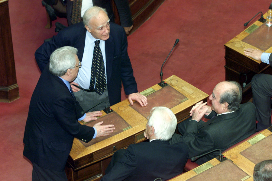 Μάιος του 2001. Προ ημερησίας διατάξεως συζήτηση σε επίπεδο πολιτικών αρχηγών στη Βουλή για την Οικονομία. Διακρίνονται από αριστερά : Πέτρος Μολυβιάτης, Κάρολος Παπούλιας, Τζανής Τζαννετάκης και Κωνσταντίνος Μητσοτάκης