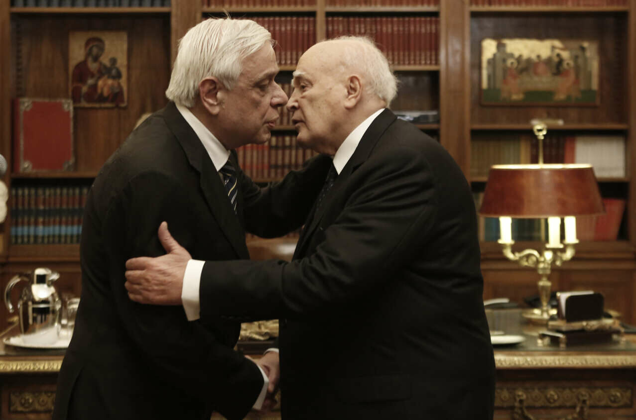 O Κάρολος Παπούλιας ασπάζεται τον νέο Πρόεδρο της Δημοκρατίας Προκόπη Παυλόπουλο κατά την τελετή παράδοσης - παραλαβής στο Προεδρικό Μέγαρο το 2015