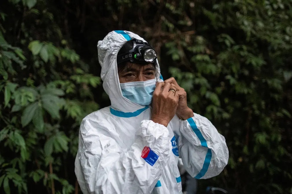 Ο Εντισον Κοσίκο, ένας από τους ερευνητές, φοράει την προστατευτική του στολή. «Ποτέ δεν ξέρεις αν μια νυχτερίδα είναι ήδη φορέας. Ψάχνουμε να δούμε αν υπάρχουν και άλλοι ιοί που μπορεί να μεταδώσουν οι νυχτερίδες στους ανθρώπους. Δεν μπορούμε να ξέρουμε αν ένας από αυτούς θα αποδειχθεί παρόμοιος με αυτόν που προκάλεσε την πανδημία», λέει