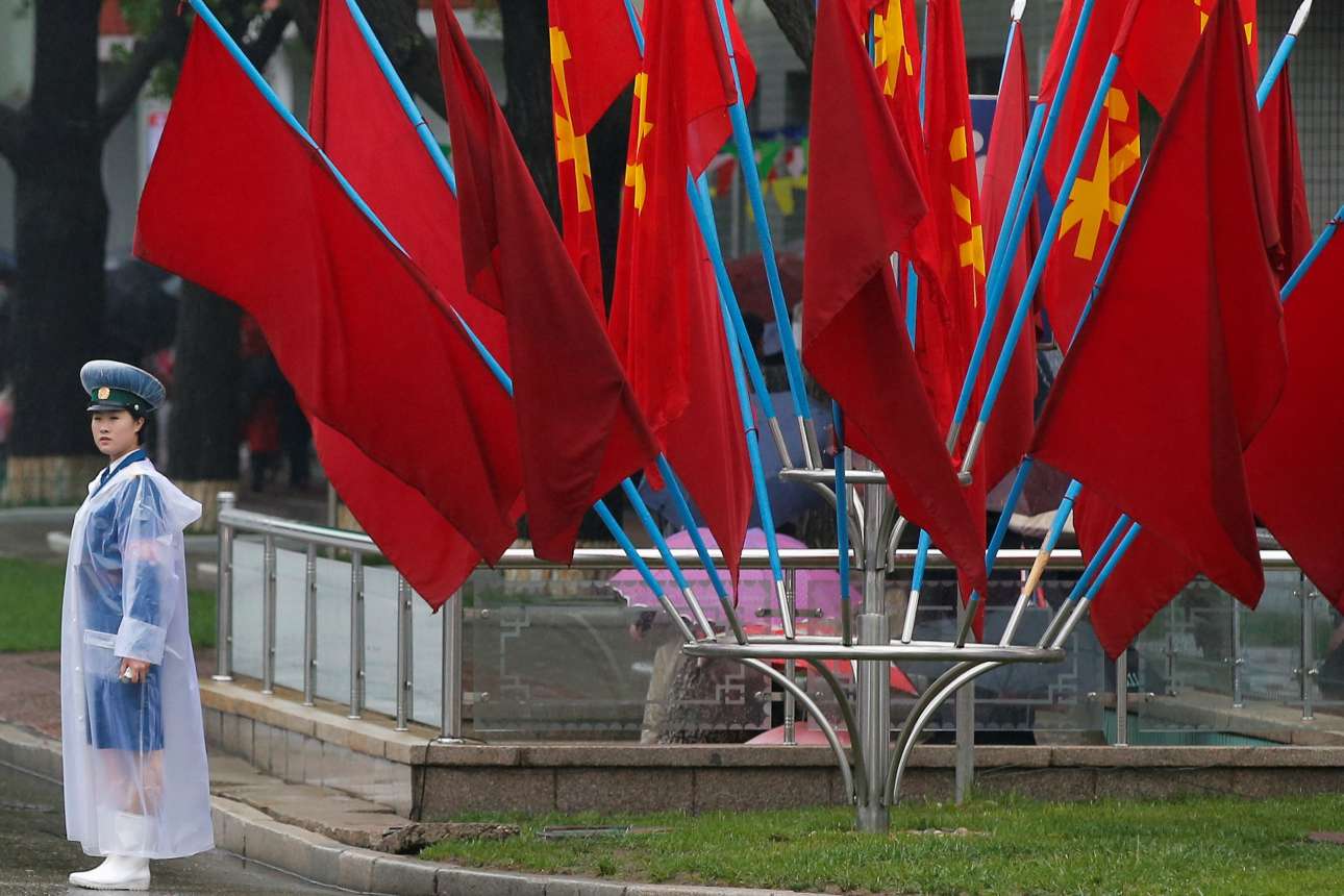 Η 6η Μαΐου ξημέρωσε βροχερή. Ενας τροχονόμος με το αδιάβροχό του στέκεται σε κεντρικό δρόμο της Πιονγιάνγκ για να ελέγξει την κίνηση των όχι και τόσο πολλών οχημάτων