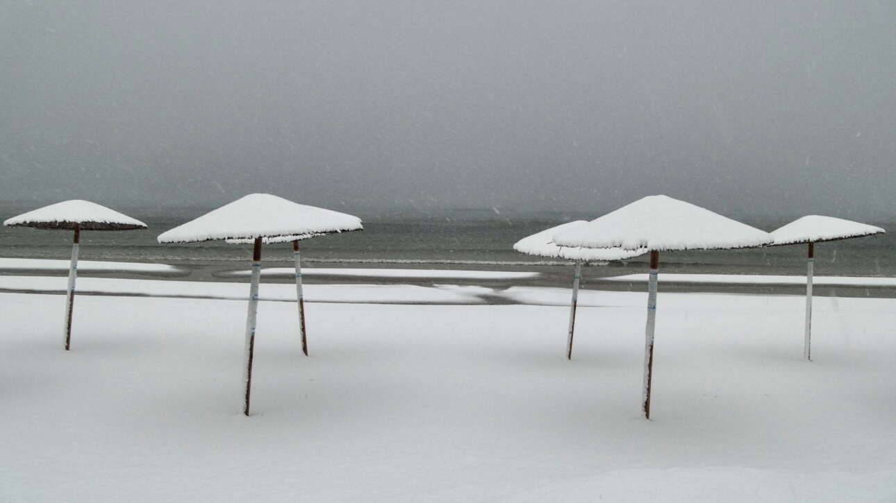 Χιονισμένη ως εκεί που σκάει το κύμα η παραλία της Αρτέμιδας στην Αττική