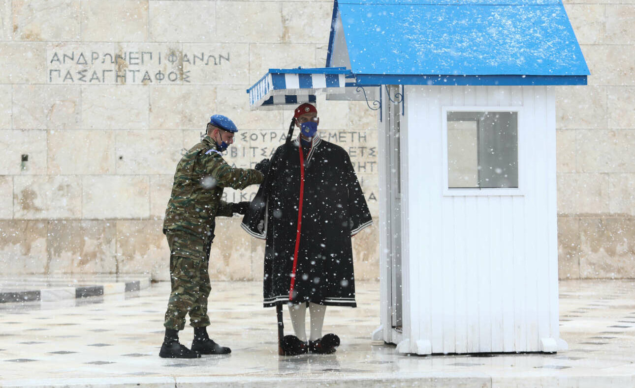 Ανδρας της Προεδρικής Φρουράς ντύνει τον εύζωνα με την υπέροχη χειμερινή κάπα, στο μνημείο του Αγνωστου Στρατιώτη, ενώ το χιόνι ήδη πέφτει πυκνό