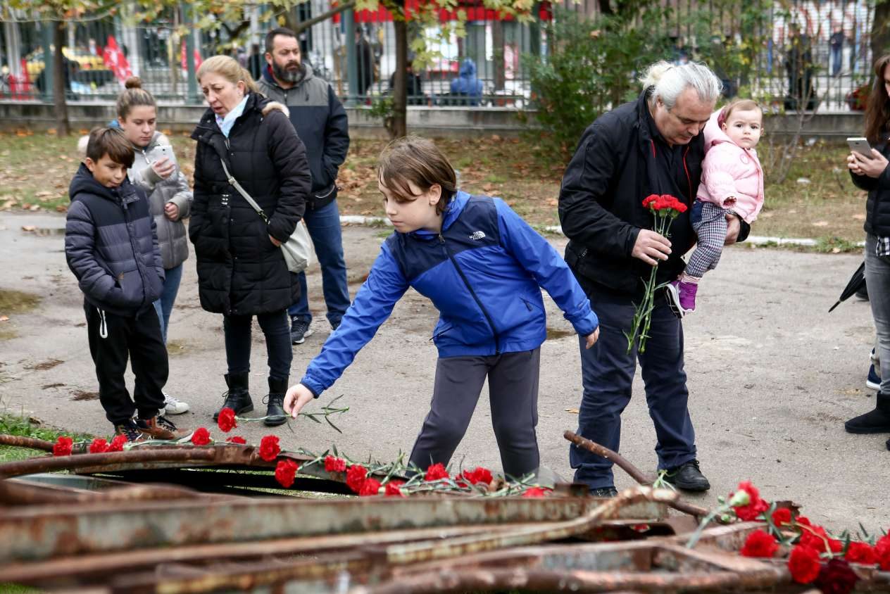 Μικροί και μεγάλοι αφήνουν λίγα κόκκινα τριαντάφυλλα πάνω στην πύλη που γκρέμισε το τανκ της χούντας