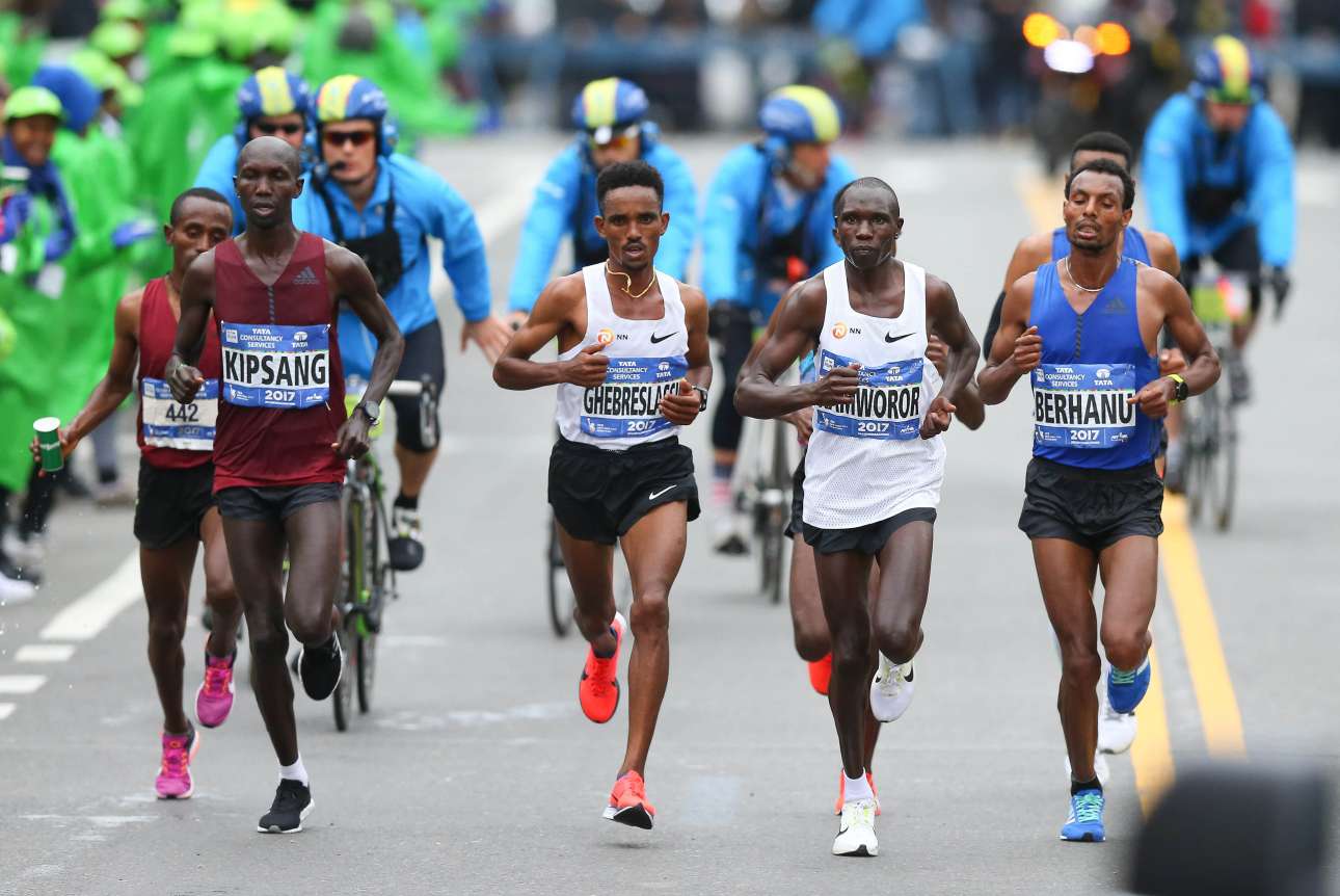 Οι πρωτοπόροι στην τελική ευθεία του Μαραθωνίου. Τελικά ο Τζέφρι Κιπσάνγκ Καμγουορόρ (δεύτερος από δεξιά) έκοψε πρώτος το νήμα