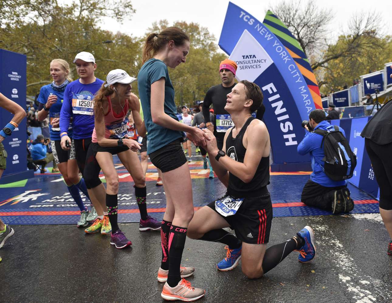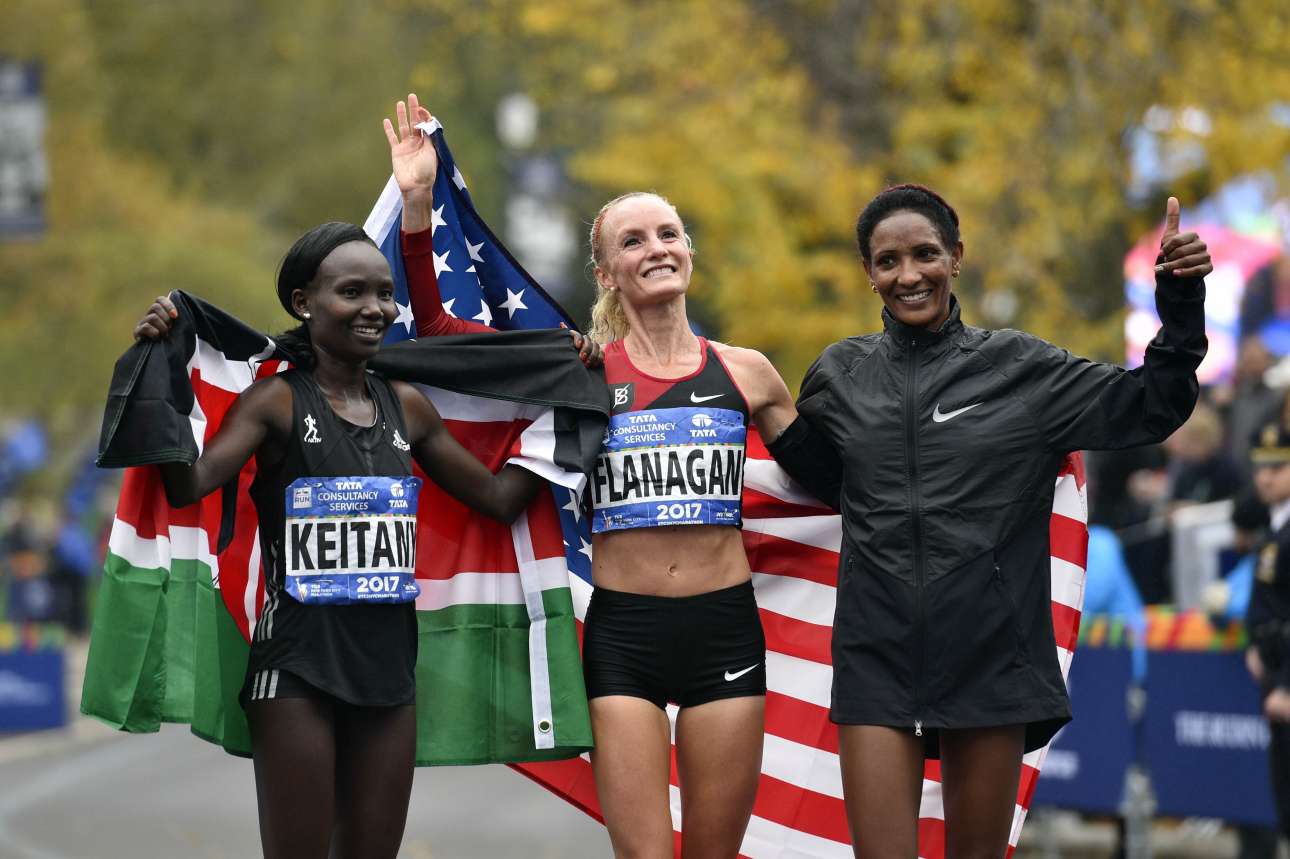 Στις γυναίκες, η Σάλειν Φλάναγκαν από τις ΗΠΑ (στο μέσον) τερμάτισε σε 2:26:53, με δεύτερη την Μέρι Κεϊτανί (Κένυα) με 2:27:54 και τρίτη την Μαμίτου Ντάσκα (Αιθιοπία) με 2:28:08. Ετσι για πρώτη φορά τα τελευταία 40 χρόνια, από το 1977, μία Αμερικανίδα τερμάτισε πρώτη στο μαραθώνιο γυναικών της Νέας Υόρκης