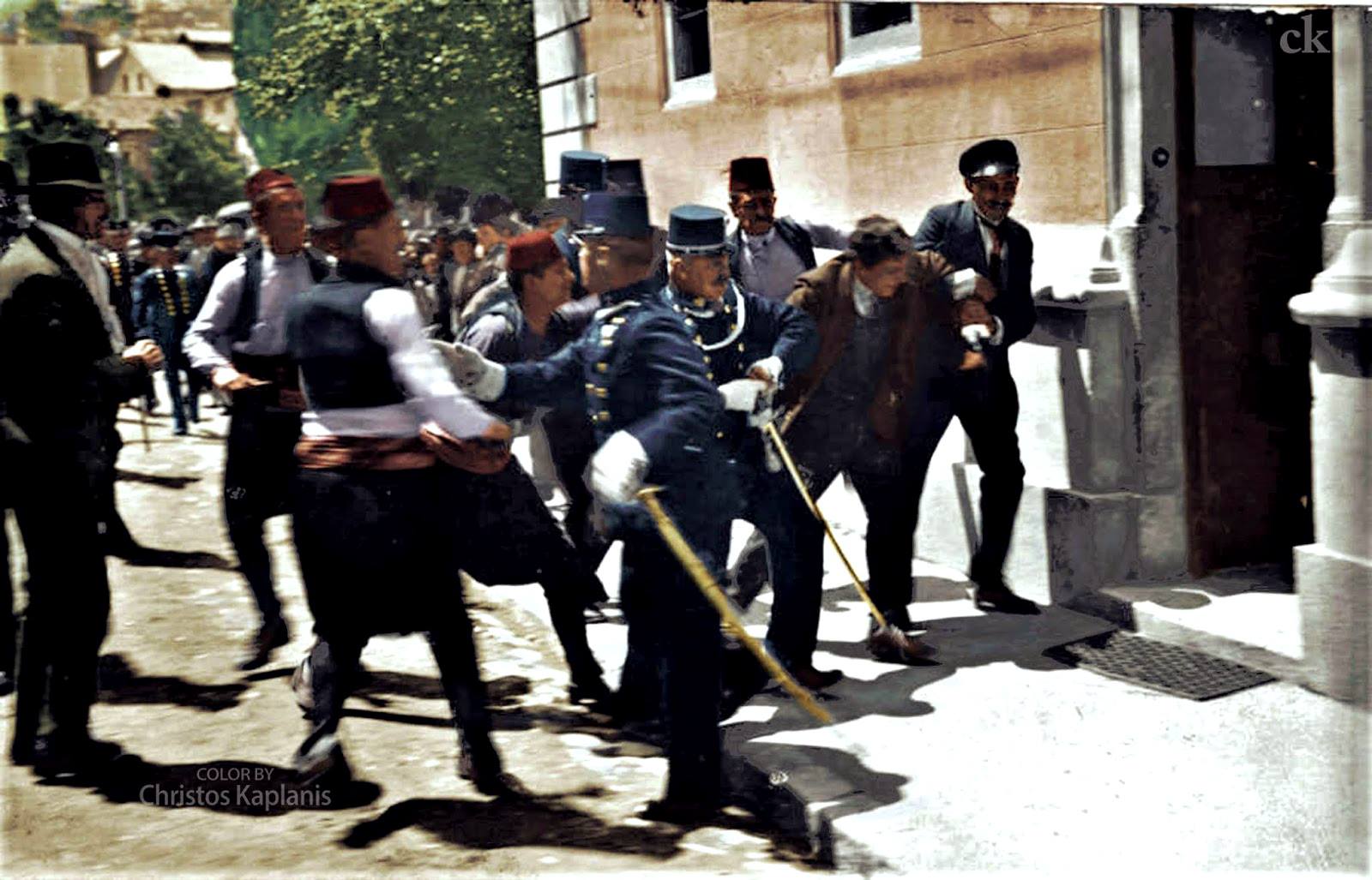 Σεράγιεβο, 28 Ιουνίου 1914. Η σύλληψη του Γκαβρίλο Πρίντσιπ, του Σέρβου που δολοφόνησε τον αυστριακό Αρχιδούκα Φραγκίσκο Φερδινάνδο, σημαίνοντας την έναρξη του Α’ Παγκοσμίου Πολέμου