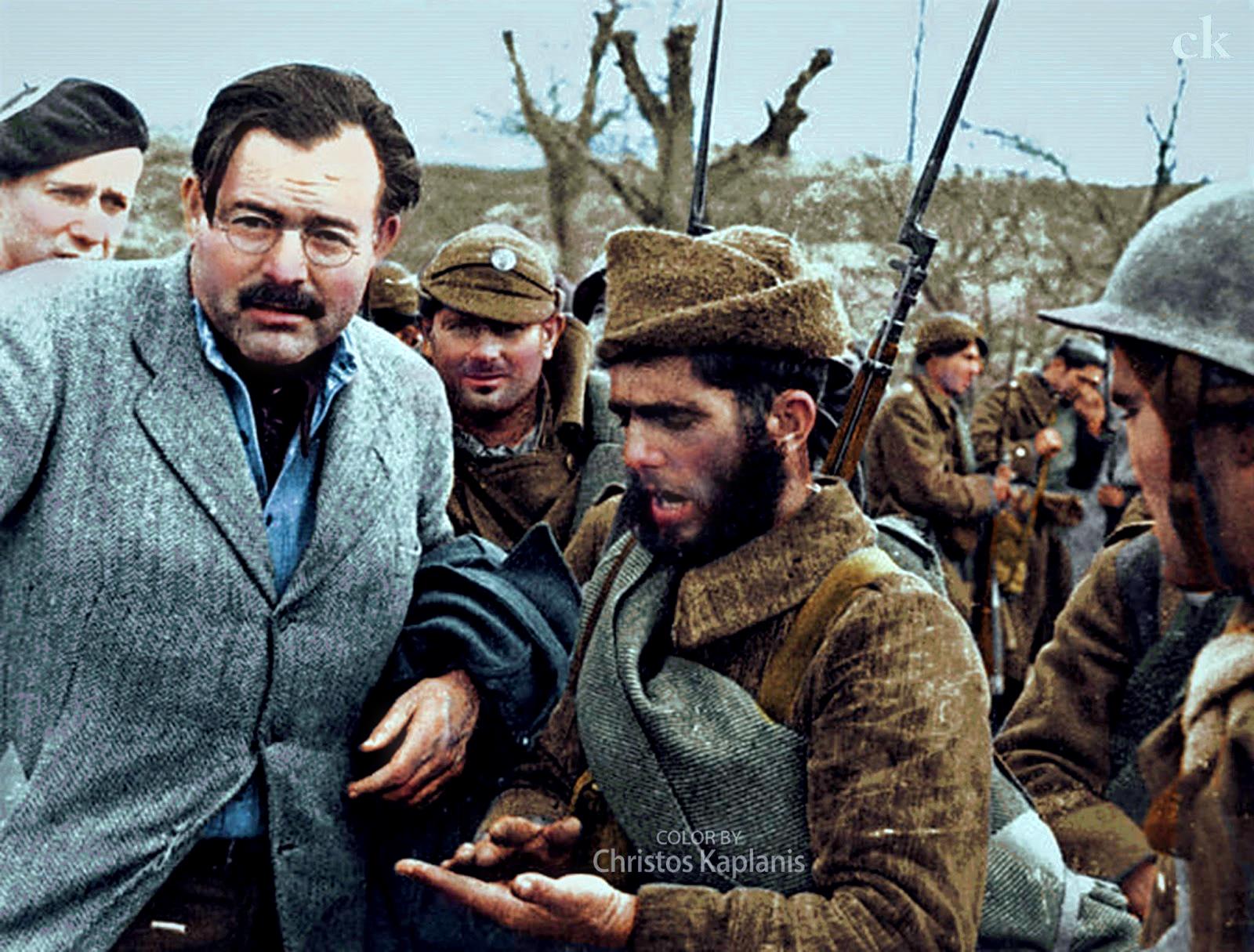 O αμερικανός συγγραφέας και δημοσιογράφος Έρνεστ Χέμινγουεϊ με πολιτοφύλακες του Δημοκρατικού Στρατού στην πρώτη γραμμή του ισπανικού Εμφυλίου, στο Τερουέλ, τον Δεκέμβριο του 1937