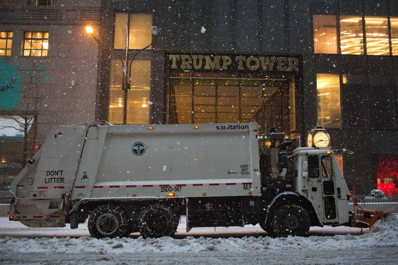 Ειδικά αυτοκίνητα στην μάχη του καθαρισμού των κεντρικών δρόμων μπροστά από τον διάσημο «Πύργο Τραμπ» στη Νέα Υόρκη
