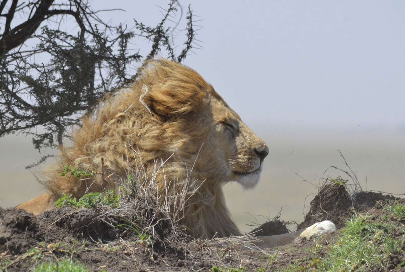 «Στο έλεος της Μητέρας Φύσης». «Καθώς ετοιμαζόμασταν να φύγουμε από το Σερενγκέτι (εθνικό πάρκο της Τασμανίας), εντοπίσαμε το μεγαλύτερο λιοντάρι που είχαμε δει στο ταξίδι μας, το οποίο όμως κοιμόταν βαθιά. Ηταν κουλουριασμένο σαν μπάλα, κοιτάζοντας προς την αντίθετη μεριά από το όχημά μας. Περιμέναμε είκοσι λεπτά, ελπίζοντας πως θα ξυπνήσει. Χρειάστηκε η μητέρα Φύση και μία ανεμοθύελλα για να ενοχληθεί το μεγαλοπρεπές αυτό πλάσμα. Ξύπνησε αρκετά αναστατωμένο και όταν ο άνεμος κόπασε, επέστρεψε στον υπνάκο του» γράφει η φωτογράφος στη συνοδευτική λεζάντα