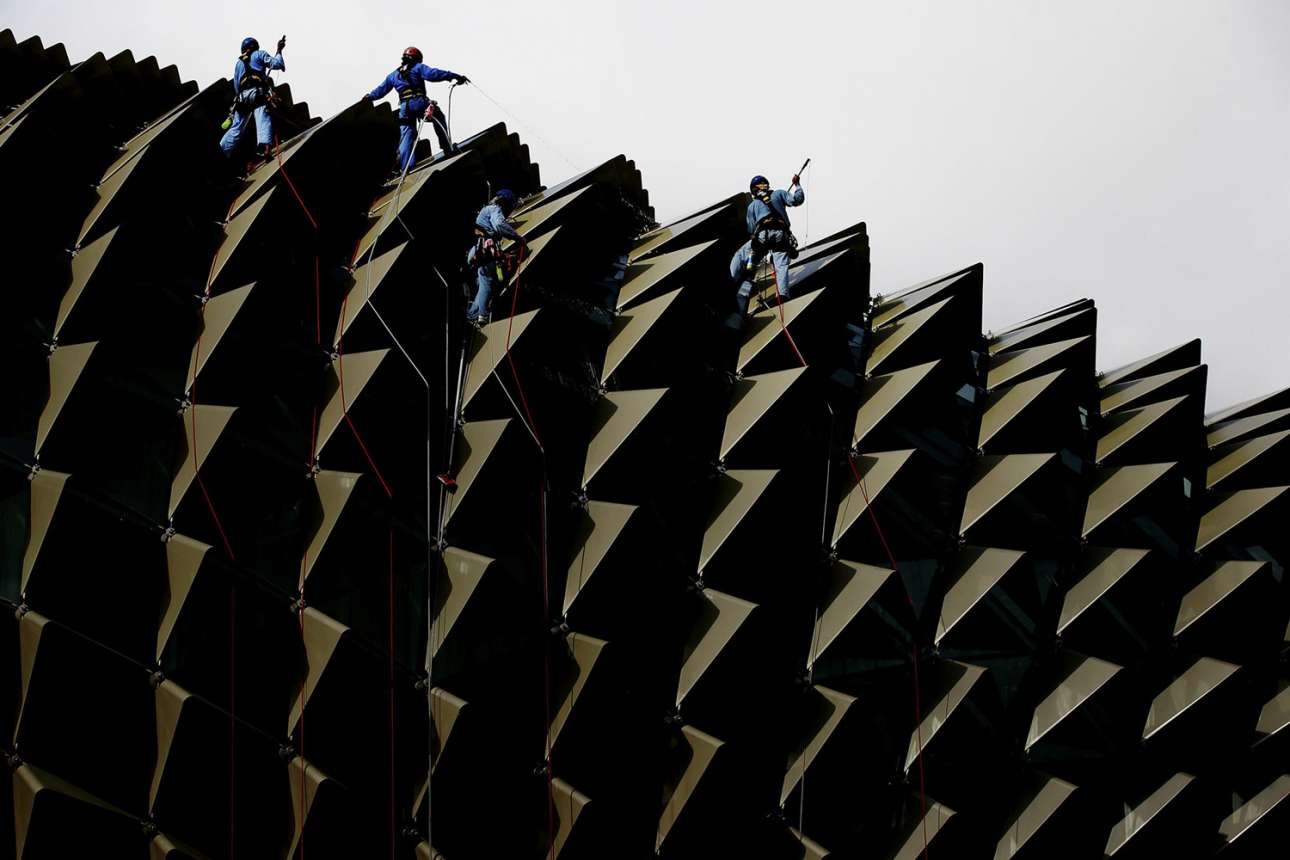 «Αφανείς ήρωες». Μία πολύ επικίνδυνη δουλειά, αλλά κάποιος πρέπει να την κάνει.. Καθαριστές δεμένοι με σκοινιά, καθαρίζουν το αρχιτεκτονικό «κόσμημα» της Σιγκαπούρης, το εμβληματικό κτίριο του κέντρου τεχνών Esplanade