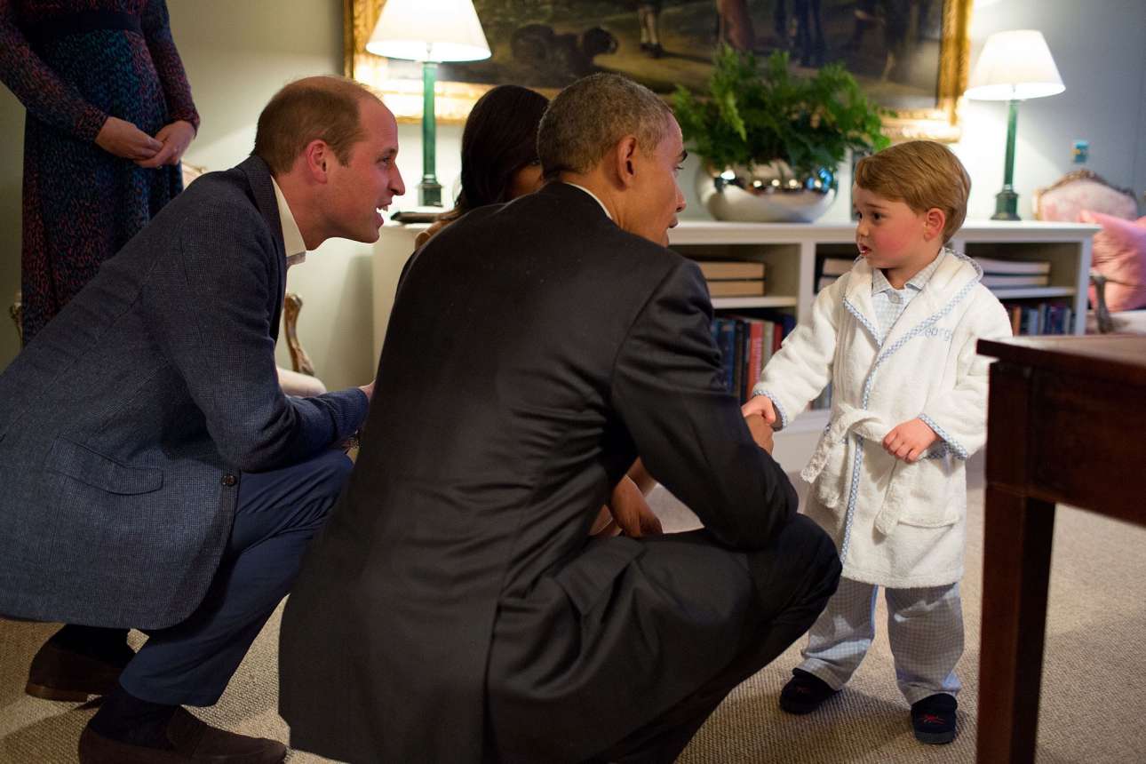 Απρίλιος: Η αξέχαστη στιγμή που ο πρόεδρος των ΗΠΑ συνάντησε τον μικρό πρίγκηπα της Βρετανίας. Ο χαριτωμένος Τζορτζ τους υποδέχτηκε φορώντας τη ρόμπα και τις παντόφλες του. Η φωτογραφία αυτή είχε κάνει τον γύρο του κόσμου, όμως τη στιγμή που την τραβούσε ο Σόουζα το μόνο που σκεφτόταν ήταν η γωνία του τραπεζιού που του χαλούσε το κάδρο